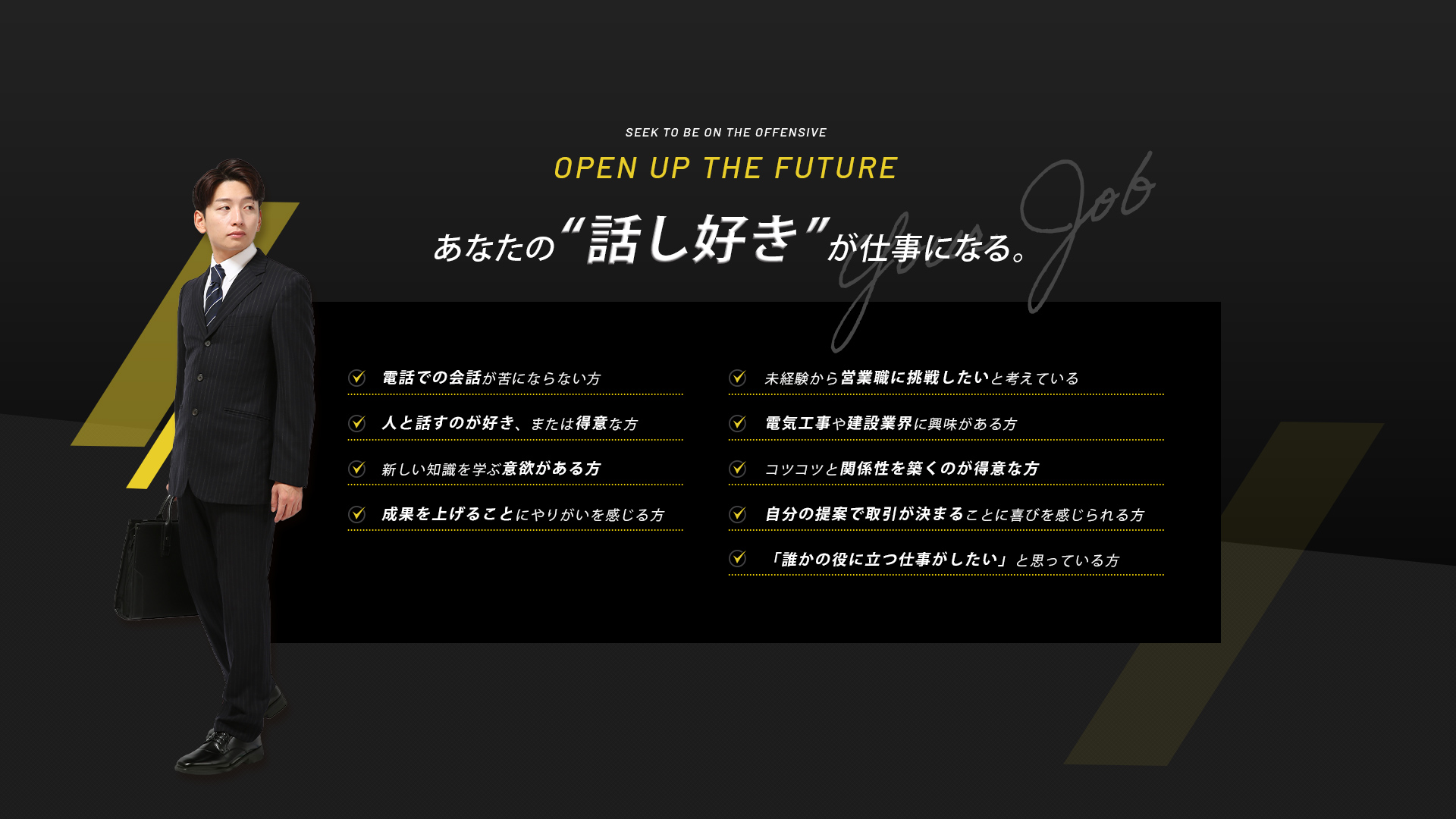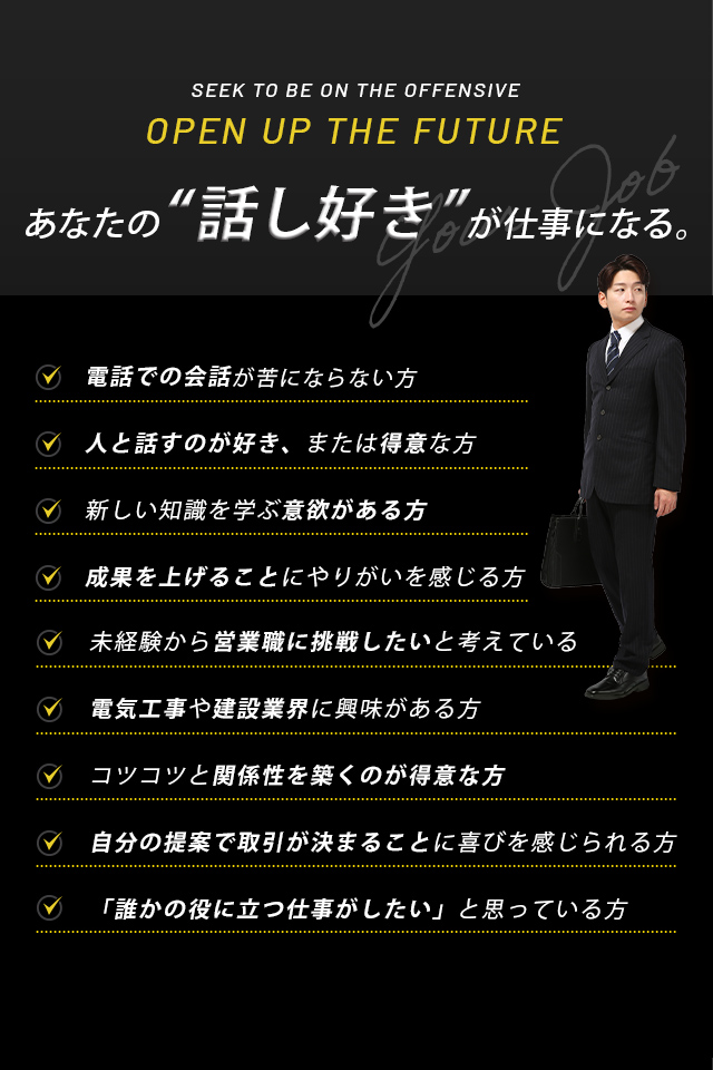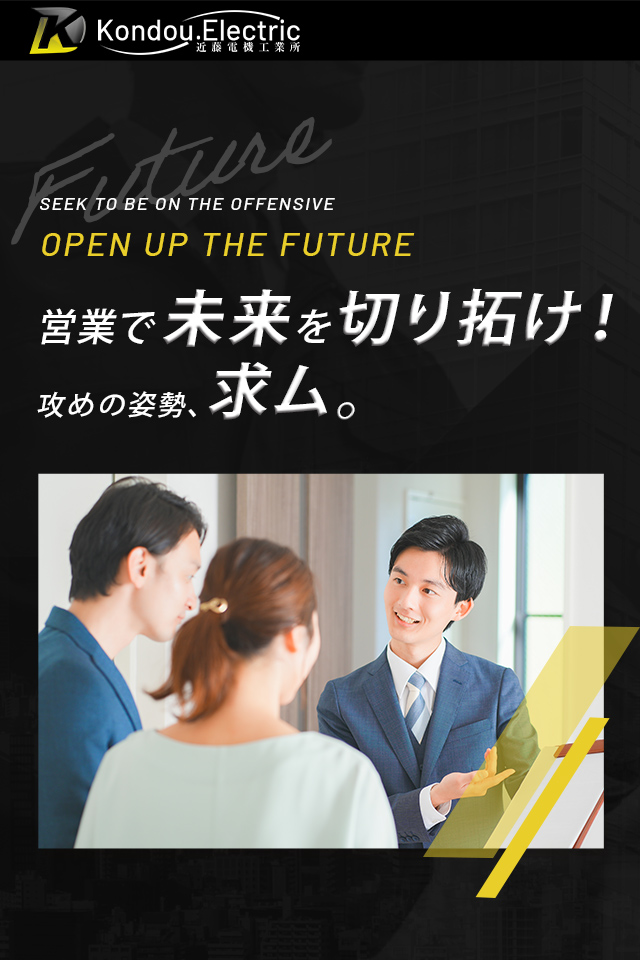 営業経験がない方でも、「やってみたい」「学んでみたい」という前向きな気持ちがあれば大丈夫。電気工事や建設の知識は入社後に丁寧に教えていきます。初めは覚えることが多いかもしれませんが、ひとつずつ学び、できることが増えていく過程にやりがいを感じられるはずです。新しい知識や業界について積極的に吸収する意欲がある方には、確実に成長できる環境が整っています。