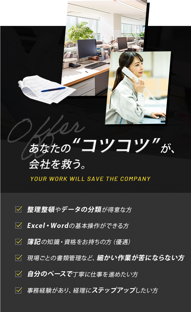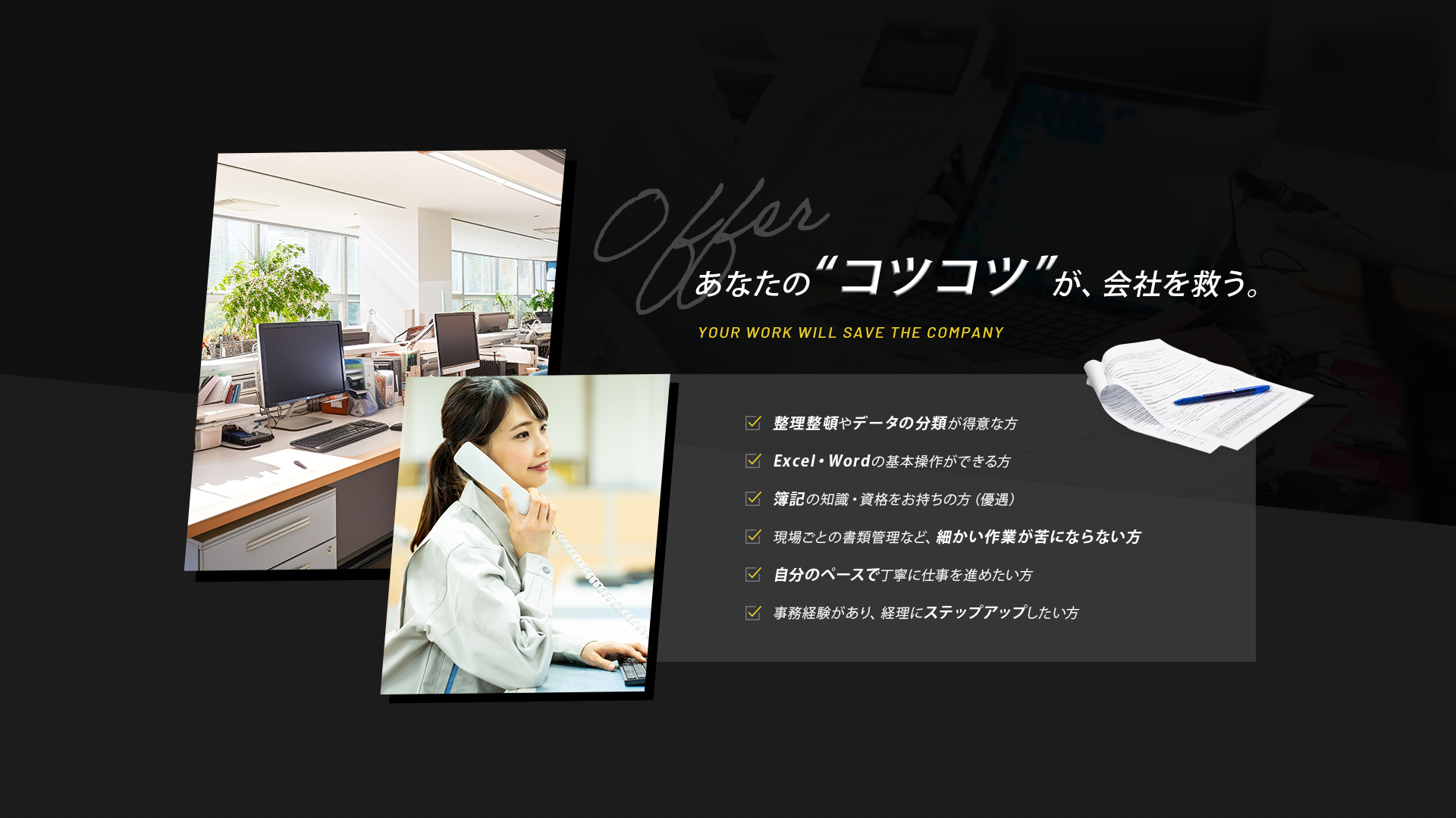 自分の仕事に責任を持ち、最後までやり遂げる姿勢を大切にしています。特に、現場ごとの書類管理や経費処理といった細かい作業が多いため、ミスなく丁寧に対応できる方を歓迎します。また、これまで事務経験がある方で「もっと専門性を高めたい」「経理のスキルを身につけたい」というステップアップ志向の方にもぴったりの環境です。確実な成長をサポートする体制が整っているので、長く腰を据えて働きたい方におすすめです。