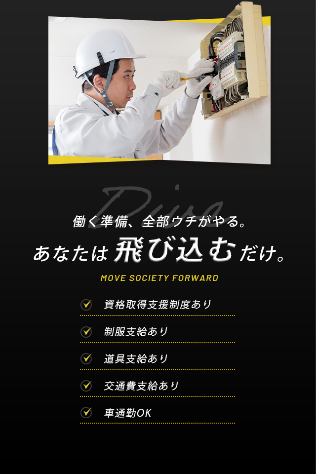 電気工事に関する専門的な技術や知識を身につけていただくために、資格取得支援制度を導入しております。第1種・第2種電気工事士をはじめ、業務に必要な各種資格の取得費用を会社が一部または全額負担する制度を整え、働きながらスキルアップを目指せる環境を提供しています。未経験の方でも安心してチャレンジできるよう、先輩社員によるサポート体制も万全です。将来的なキャリアアップを目指す方には最適な職場です。